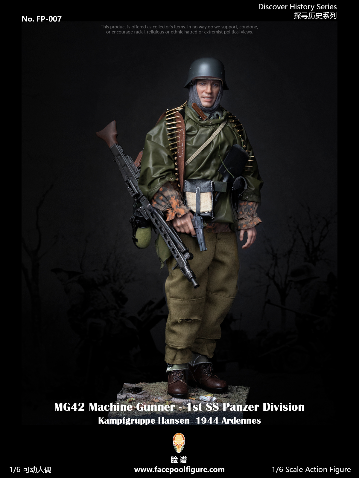 Facepoolfigure 脸谱模玩 1/6可动人偶 – 探寻历史系列 – 阿登反击战机枪手FP007A 普通版配件清单:逼真头雕可动素体(含6只手型)M42头盔(金属)M43制服上衣+长裤M40 橡树迷彩罩衫MG42机枪MG42机枪子弹链(铜制金属穿环)美军M43长裤加强款美军雨披 (定制超轻薄防水面料)绑腿作战靴(真皮)棉质头套负重带(真皮)皮带(真皮)机枪维护包(真皮)手枪套(真皮)勃朗宁大威力手枪(比利时产,含折叠瞄具)防毒面具筒饭盒臀包水壶格斗匕首工兵铲领章,臂章袖带战伤勋章士兵突击勋章FP007B特别版额外包含以下:微笑头雕情景地台(含支架,落叶x12,香烟x2)1:1比例仿真士兵身份牌*特别版限量798套 - 中国区399套+海外区399套预计出货日期2022年第二季度, 预订截单日期2021年12月01日Facepoolfigure 1/6 Action Figure - Discover History Series MG42 Machine Gunner at ArdennesFP007A Standard Edition List:Head SculptureArticulated Body with interchangeable hands x 6M42 Helmet (Metal)M43 Field UniformM40 Oak…