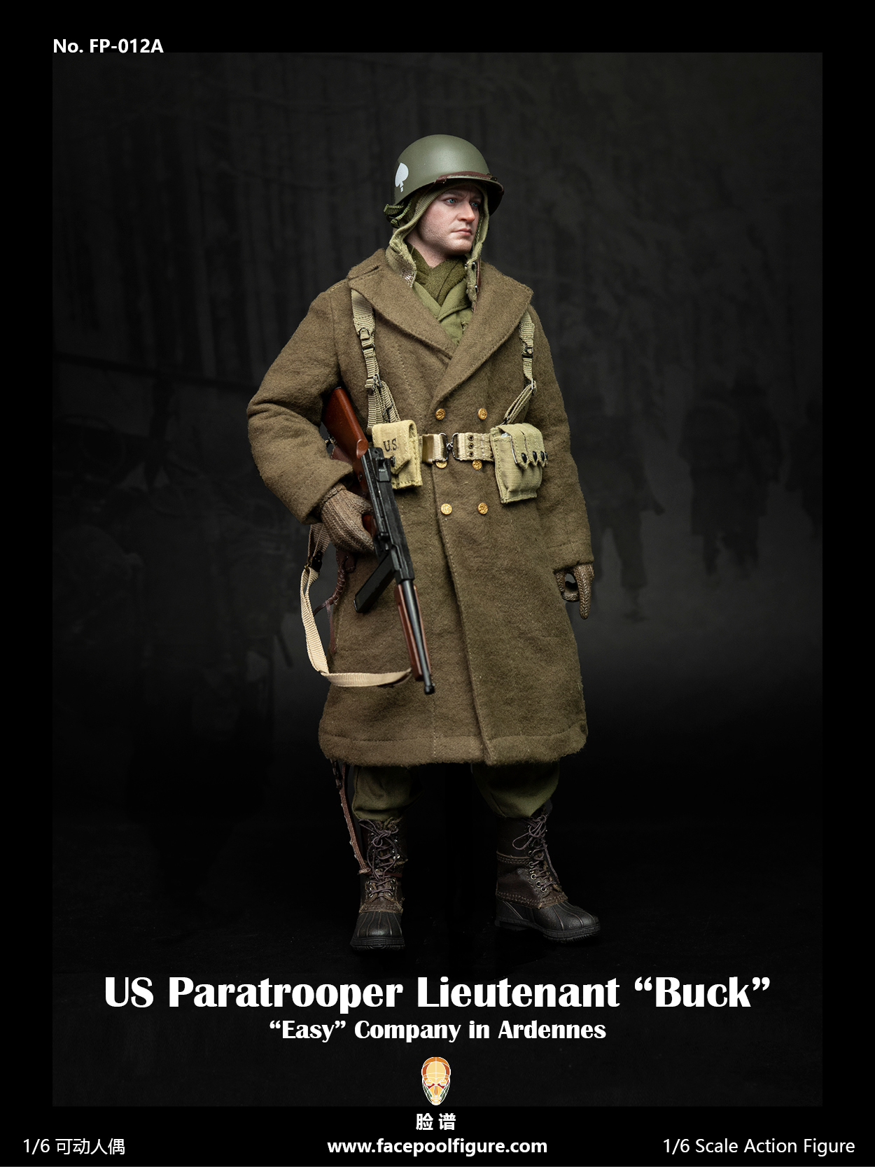 Facepoolfigure 脸谱模玩 1/6可动人偶 - 二战美军空降师- E连中尉产品编号:FP-012A (冬装版)配件说明:逼真头雕男性素体 +手型X6 (COOMODEL BD001)M1伞兵头盔(金属)M43 伞兵制服全套冬季毛大衣毛线手套手(软胶)围巾冬季头套汤姆森冲锋枪(金属实木)30发金属可装弹夹x1 + 30发塑料弹夹x1 + 20发塑料弹夹x2汤姆森弹夹包(短款)M1911A1手枪 +皮质枪套 (真皮)手枪弹夹包美军负重带GI棉质衬衫雪地靴(真皮)空降兵M6皮质刀鞘+M1918刺刀M36 腰带M10水壶+包101空降师臂章 预计出货日期2024年第一季度预订截单日期2023年4月30日     Facepoolfigure 1/6 Action Figure - US Paratrooper Lieutenant “Buck”No. FP-012A (Winter Uniform)List:Head SculptureMale Nude Body + Hands x6 (COOMODEL BD001)M1 Paratrooper Helmet (Metal)M43…